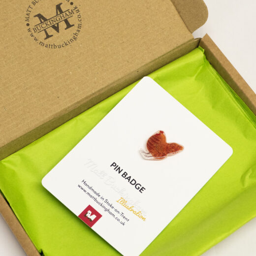 Produced using Matt Buckingham’s original artwork, this unique orpington chicken pin badge has been handmade from sheet polymer.